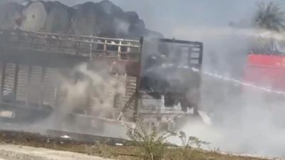 निवाड़ी: चलते मिनी ट्रक में लगी भीषण आग, चालक ने कूदकर बचाई जान