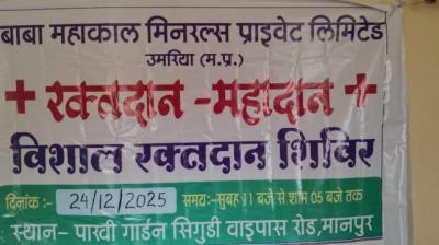 मानपुर स्थित बाबा महाकाल मिनरल्स प्राइवेट लिमिटेड रेता कंपनी के माइनिंग कंसल्टेंट अभिषेक निगम के जन्मदिवस के अवसर पर कंपनी परिसर में एक भव्य रक्तदान शिविर का आयोजन किया गया।...