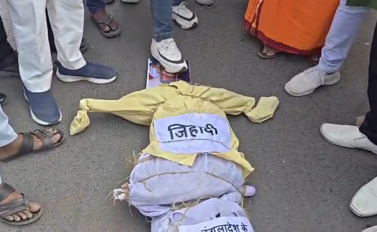 बांग्लादेश में हिंदुओं पर हो रहे अत्याचारों के विरोध में आज उज्जैन में अंतरराष्ट्रीय हिंदू परिषद और बजरंग दल द्वारा जोरदार प्रदर्शन किया गया। इस दौरान प्रदर्शनकारियों ने बांग्लादेश के राष्ट्रपति का पुतला जलाकर अपना विरोध दर्ज कराया और जमकर नारेबाजी की।बांग्लादेश में हिंदुओं पर हो रहे अत्याचारों के खिलाफ देशभर में लगातार धरना-प्रदर्शन किए जा रहे हैं। इसी कड़ी में उज्जैन के टावर चौक पर अंतरराष्ट्रीय हिंदू परिषद और राष्ट्रीय बजरंग दल के कार्यकर्ताओं ने प्रदर्शन किया। प्रदर्शन के दौरान कार्यकर्ताओं ने बांग्लादेश के राष्ट्रपति शेख यूनूस के पुतले की जूते-चप्पलों से पिटाई की और बाद में पुतला दहन किया। इस दौरान बांग्लादेश सरकार के खिलाफ जमकर नारेबाजी भी की गई।प्रदर्शन के दौरान महंत निलेश पुरी महाराज ने कहा कि बांग्लादेश में हिंदुओं पर हो रहे अत्याचार किसी भी सूरत में बर्दाश्त नहीं किए जाएंगे और भारत सरकार को इस मामले में सख्त कदम उठाने चाहिए।