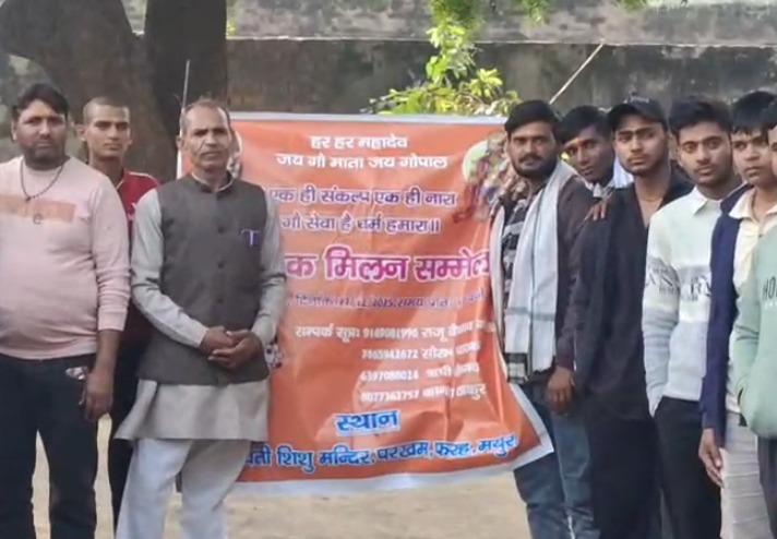 मथुरा। जनपद मथुरा के फरह क्षेत्र अंतर्गत गांव परखम में गौ सेवा को समर्पित एक महत्वपूर्ण गौ सेवक मिलन सम्मेलन का आयोजन किया गया। यह कार्यक्रम सरस्वती शिशु मंदिर, परखम परिसर में संपन्न हुआ। सम्मेलन का मुख्य उद्देश्य गौ सेवा से जुड़े लोगों को एक मंच पर एकत्र कर गौ संरक्षण, संवर्धन और सेवा के प्रति समाज में जागरूकता फैलाना रहा।सम्मेलन में फरह क्षेत्र के विभिन्न गांवों से आए बड़ी संख्या में गौ सेवकों, सामाजिक कार्यकर्ताओं, साधु-संतों और ग्रामीणों ने सहभागिता की। कार्यक्रम के दौरान वक्ताओं ने गौ माता को भारतीय संस्कृति का आधार बताते हुए कहा कि गौ सेवा केवल धार्मिक कार्य नहीं, बल्कि सामाजिक और मानवीय जिम्मेदारी भी है। उन्होंने कहा कि गौ संरक्षण से समाज में नैतिकता, करुणा और सकारात्मकता का विकास होता है।कार्यक्रम में गौवंश संरक्षण, गौशालाओं का सुचारू संचालन, घायल एवं बेसहारा गौवंश की देखभाल, चारे-पानी की व्यवस्था, सड़क दुर्घटनाओं से गौवंश की सुरक्षा जैसे महत्वपूर्ण विषयों पर विस्तार से चर्चा की गई। वक्ताओं ने युवाओं से आह्वान किया कि वे आगे आकर गौ सेवा से जुड़ें और इस पुण्य कार्य में तन-मन-धन से सहयोग करें।इस अवसर पर बांके बिहारी को सेवा संस्थान के राष्ट्रीय अध्यक्ष नीरज शर्मा, फरसा वाले बाबा, योगेश कुमार (गौ सेवक), दिनेश ठाकुर (गौ सेवक), राजू वैष्णव (गौ सेवक), कान्हा ठाकुर (गौ सेवक), सौरव पाठक (गौ सेवक), लक्ष्मण सिंह (पत्रकार), सोनू पाठक (पत्रकार) सहित अनेक गणमान्य लोग उपस्थित रहे।सभी अतिथियों ने अपने विचार व्यक्त करते हुए कहा कि गौ सेवा भारतीय संस्कृति की आत्मा है और समाज के प्रत्येक व्यक्ति को इसमें अपनी भूमिका निभानी चाहिए। सम्मेलन के अंत में गौ माता की आरती की गई तथा सभी उपस्थित लोगों ने गौ सेवा का संकल्प लिया।