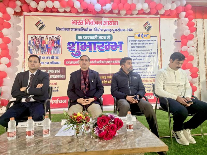 बीएसए कॉलेज सभागार में मंगलवार को विशेष प्रगाढ़ पुनरीक्षण अभियान 2026 के तहत मतदाता सूची के आलेख्य प्रकाशन से संबंधित कार्यक्रम आयोजित किया गया। कार्यक्रम में जिला निर्वाचन अधिकारी एवं जिलाधिकारी चंद्र प्रकाश सिंह, अपर जिलाधिकारी वित्त एवं राजस्व/उप जिला निर्वाचन अधिकारी डॉ. पंकज कुमार वर्मा, ज्वाइंट मजिस्ट्रेट/उप जिलाधिकारी सदर अभिनव जे. जैन, जिला विद्यालय निरीक्षक रविंद्र कुमार तथा विभिन्न राजनीतिक दलों के प्रतिनिधि मौजूद रहे।कार्यक्रम के दौरान जिलाधिकारी ने विशेष प्रगाढ़ पुनरीक्षण अभियान 2026 के अंतर्गत तैयार की गई मतदाता सूची की दो प्रतियां—एक हार्ड कॉपी और एक सॉफ्ट कॉपी—भारतीय जनता पार्टी, कांग्रेस, समाजवादी पार्टी, बहुजन समाज पार्टी सहित अन्य दलों के जिलाध्यक्षों को सौंपी। इस अवसर पर उपस्थित राजनीतिक दलों के प्रतिनिधियों, अधिकारियों, शिक्षकों और छात्र-छात्राओं ने मतदाता शपथ भी ली।जिलाधिकारी ने बताया कि 6 जनवरी 2026 को मतदाता सूची का आलेख्य प्रकाशन किया गया और 6 जनवरी से 6 फरवरी 2026 तक मतदाता सूची से संबंधित दावे और आपत्तियां प्राप्त की जाएंगी। इसके बाद 6 जनवरी से 27 फरवरी 2026 तक नोटिस चरण, गणना प्रपत्रों पर निर्णय तथा दावे व आपत्तियों का निस्तारण किया जाएगा। अंतिम मतदाता सूची का प्रकाशन 6 मार्च 2026 को किया जाएगा।