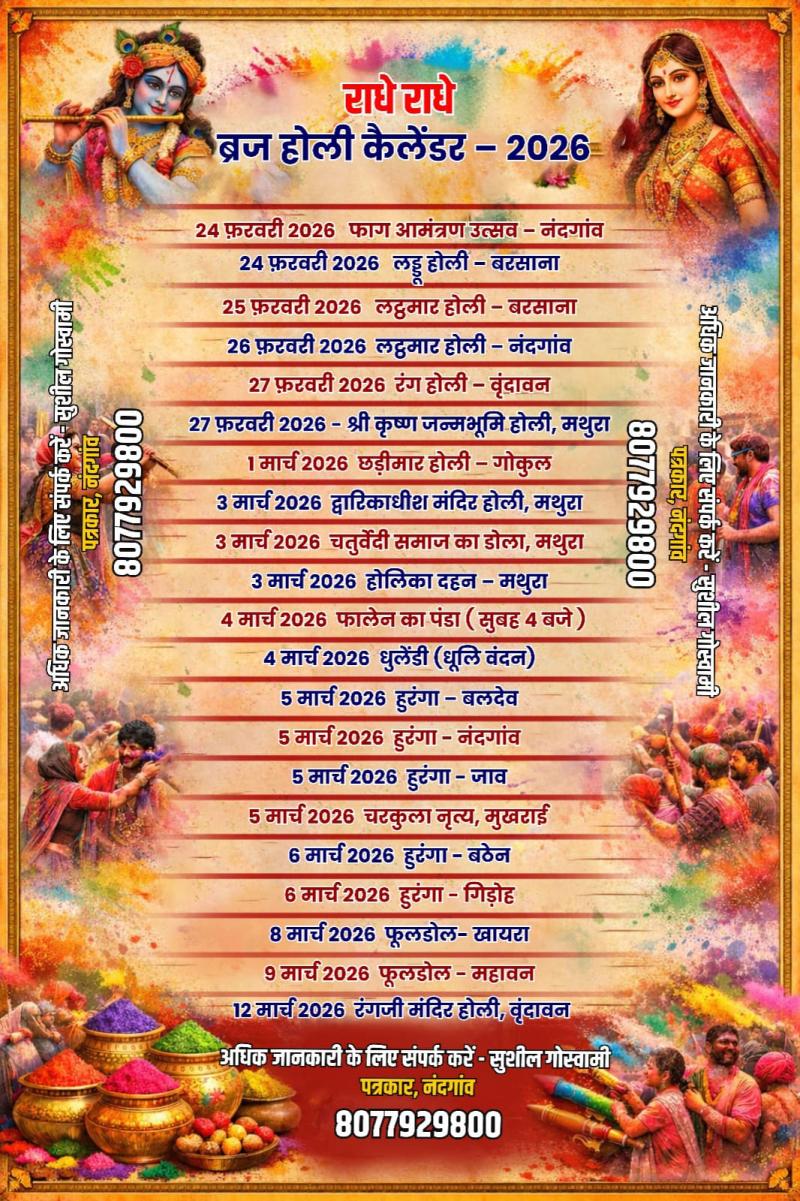 मथुरा के द्वारकाधीश मंदिर और वृंदावन के ठाकुर बांके बिहारी जी मंदिर सहित संपूर्ण बृजमंडल के प्रमुख मंदिरों में आज 23 जनवरी से विश्वविख्यात 40 दिवसीय होलिकोत्सव का शुभारंभ हो रहा है। बसंत पंचमी के पावन अवसर पर वृंदावन स्थित ठाकुर बांके बिहारी महाराज के मंदिर में रंग-गुलाल उड़ाकर फागोत्सव की विधिवत शुरुआत की जाएगी।इतिहासकार एवं विद्वान आचार्य प्रहलाद बल्लभ गोस्वामी महाराज ने बताया कि परंपरा के अनुसार बसंत पंचमी के दिन ही बांके बिहारी जी के दरबार से होलिकोत्सव का शुभारंभ होता है। इस अवसर पर ठाकुर बांके बिहारी महाराज का विशेष बसंती पोशाक एवं अलंकारों से भव्य श्रृंगार किया जाएगा। भगवान के कोमल कपोलों पर गुलाल एवं कुमकुम लगाया जाएगा तथा सरसों के पुष्पों से निर्मित सुगंधित मालाएं अर्पित की जाएंगी।बसंत पंचमी के दिन ठाकुर जी को केसरिया छैना की खीर, अधूटा, मोहनभोग, बादाम, मूंग दाल एवं सूजी के हलुए का विशेष भोग लगाया जाएगा। इसी दिन से मंदिर में गोस्वामी समाज द्वारा होली पदों का गायन भी प्रारंभ हो जाएगा, जो पूरे फागोत्सव काल तक निरंतर चलता रहेगा।आचार्य प्रहलाद बल्लभ गोस्वामी ने बताया कि इस वर्ष 3 मार्च को पूर्णिमा के दिन चंद्रग्रहण पड़ रहा है। इसी कारण ठाकुर बांके बिहारी मंदिर में रंगीली होली का समापन एवं होलिका दहन 2 मार्च को चतुर्दशी तिथि की रात्रि में ही किया जाएगा। परंपरा के अनुसार होलिका दहन के अगले दिन धुलैड़ी पर्व मनाया जाएगा तथा मंदिर में डोलोत्सव का आयोजन होगा।डोलोत्सव के दिन ठाकुर बांके बिहारी महाराज गुलाबी पोशाक एवं बहुमूल्य रत्नजड़ित स्वर्ण आभूषण धारण कर महाराजा स्वरूप में भक्तों को दर्शन देंगे। चंद्रग्रहण के कारण 3 मार्च को दर्शन व्यवस्था सीमित रहेगी। दर्शन सुबह 9:05 बजे सूतक काल प्रारंभ होने से पूर्व तथा शाम को ग्रहण समाप्त होने के बाद ही उपलब्ध होंगे।इसके उपरांत 5 मार्च से बांके बिहारी मंदिर में ग्रीष्मकालीन दर्शन समय-सारिणी लागू हो जाएगी, जिससे दर्शन, भोग-राग एवं शयन सेवा के समय में परिवर्तन किया जाएगा।