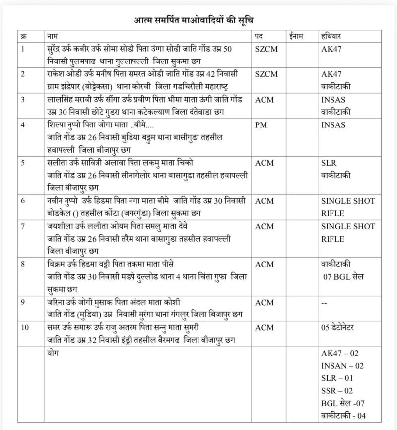 आत्मसमर्पित नक्सलियों ने पुलिस के सामने भारी मात्रा में हथियार भी जमा किए, जिनमें—