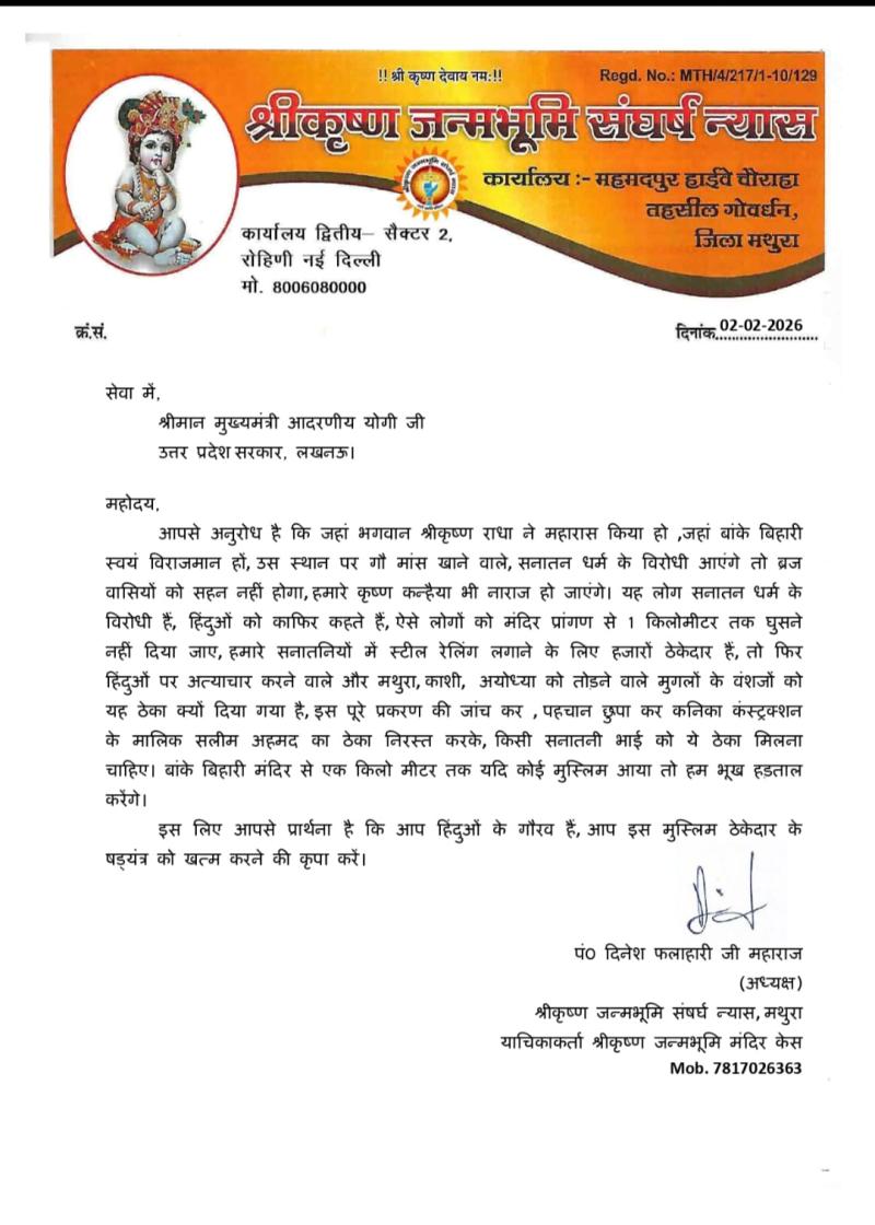 वृंदावन। ब्रजभूमि के प्रमुख धार्मिक स्थल बांके बिहारी मंदिर में स्टील रेलिंग लगाने के ठेके को लेकर विवाद गहराता जा रहा है। मंदिर परिसर में रेलिंग निर्माण का ठेका एक मुस्लिम ठेकेदार को दिए जाने पर साधु-संतों और कुछ हिंदू संगठनों ने कड़ा विरोध जताया है।श्रीकृष्ण जन्मभूमि संघर्ष न्यास के अध्यक्ष दिनेश फलाहारी महाराज ने मुख्यमंत्री को पत्र लिखकर इस ठेके को लेकर अपनी आपत्ति दर्ज कराई है। पत्र में महाराज ने कहा कि बांके बिहारी मंदिर ब्रजभूमि का अत्यंत पवित्र स्थल है, जहां भगवान श्रीकृष्ण और राधारानी की लीलाओं से जुड़ी आस्था है। ऐसे पवित्र स्थान पर किसी मुस्लिम ठेकेदार को कार्य देना ब्रजवासियों की धार्मिक भावनाओं को आहत करता है।महाराज ने आरोप लगाया कि सनातन धर्म के विरोधी माने जाने वाले लोगों को मंदिर से जुड़े कार्य नहीं दिए जाने चाहिए। उन्होंने यह भी कहा कि ब्रज क्षेत्र में हजारों योग्य हिंदू ठेकेदार मौजूद हैं, इसके बावजूद पहचान छिपाकर एक मुस्लिम ठेकेदार को ठेका दिया जाना संदेह पैदा करता है।उन्होंने प्रशासन से निष्पक्ष जांच की मांग की है और कहा कि यदि नियमों में कोई अनियमितता पाई जाती है तो संबंधित ठेका तत्काल निरस्त किया जाए।पत्र में यह भी उल्लेख किया गया कि मंदिर और उसके आसपास के क्षेत्र में इस फैसले को लेकर असंतोष है और साधु-संतों के साथ-साथ स्थानीय लोगों में भी नाराजगी देखी जा रही है। संतों का कहना है कि मंदिर से जुड़े कार्यों में पारदर्शिता और श्रद्धालुओं की भावनाओं का सम्मान होना चाहिए।इस मुद्दे को लेकर ब्रजभूमि के कई साधु-संतों ने एकजुट होकर विरोध दर्ज कराया है और प्रशासन से जल्द निर्णय लेने की मांग की है। वहीं, प्रशासनिक स्तर पर अभी तक कोई आधिकारिक बयान सामने नहीं आया है। माना जा रहा है कि मुख्यमंत्री कार्यालय तक मामला पहुंचने के बाद संबंधित विभाग पूरे प्रकरण की जांच कर सकता है।फिलहाल, बांके बिहारी मंदिर का यह ठेका विवाद चर्चा का विषय बना हुआ है और सभी की निगाहें प्रशासन के अगले कदम पर टिकी हैं।