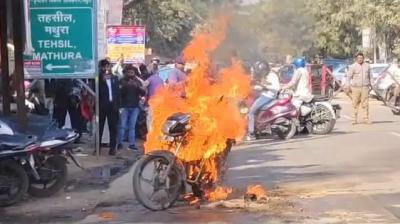 मथुरा में पार्किंग में बाइक लगी आग, पुलिसकर्मी ने बड़ा हादसा टाला