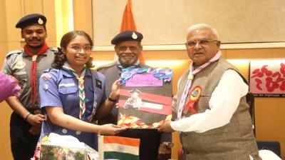 राज्यपाल पटेल को भारत स्काउट्स एवं गाइड्स का बैज और स्कार्फ पहनाया